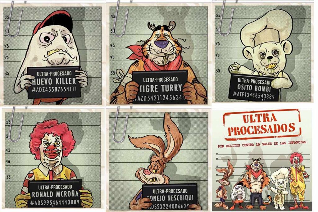 “Postres lácteos rosa chicle. Cereales crocantes de azúcar. Jugos hechos con perfume de frutas que no existen. Pescado, pollo, milanesa: todo congelado, empanado, para comer con la mano y en un santiamén. Panes más mullidos y blancos que una almohada de hotel. Menús que prometen a la vez indulgencia y nutrición. Paquetes tan animados como un programa de la tele. Juegos, juguetes, personajes en los que se puede creer, a los que llegamos a querer.